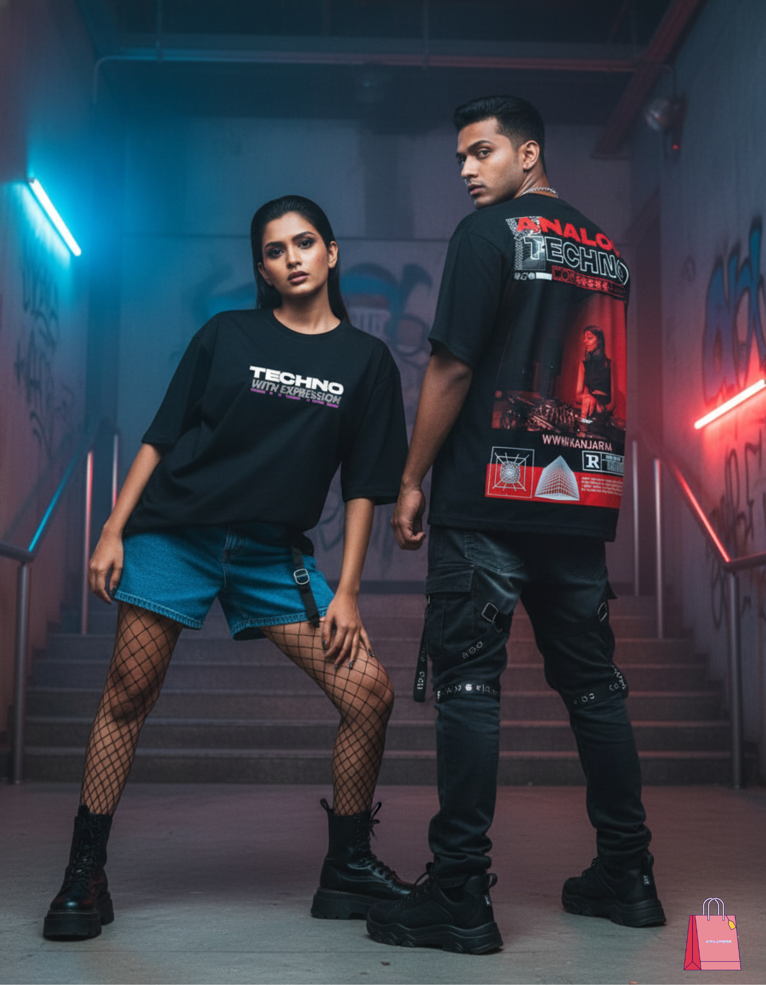 Kanjaraa Analog Techno Oversized T-shirts blend contemporary streetwear style with comfort and durability. Crafted for a relaxed fit, these oversized tees provide freedom of movement while making a bold fashion statement. Their analog techno-inspired design adds a unique, edgy aesthetic, perfect for those seeking to express individuality through modern casual wear. Ideal for everyday use, they pair effortlessly with various outfits, delivering both style and comfort in one versatile piece.